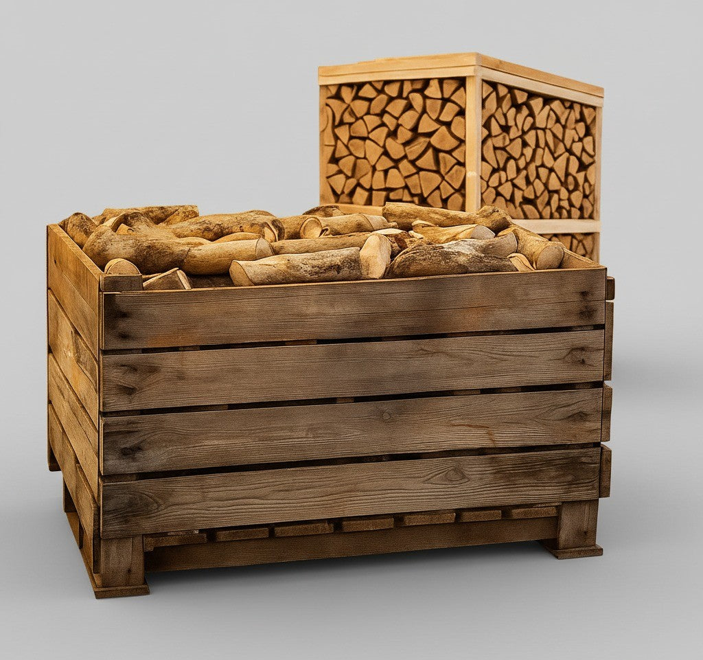 OBS: Trækasserne kan have mindre skader, da de er genbrugte. Vi bytter ikke kasserne, da de kun er beregnet til at levere brændet til dig. Produktet bør om stables ved modtagelse, da kasserne ikke egner sig til langvarig opbevaring udendørs, og træet kan have spor af borebiller, der har angrebet det inden tørring.